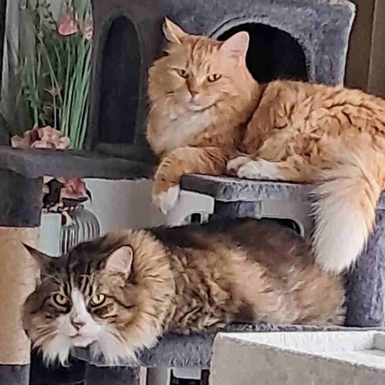 Guizmo, 8 ans(couleur martin et blanc) et Scarla, 9 ans (rousse)